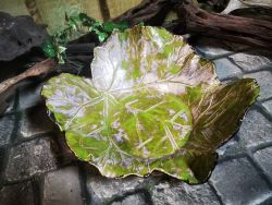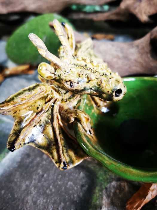 die Schale in Grün mit hellbraunen unregelmäßigen Flecken, der Drache hellbraun mit dunkelbraunen und grünen Effekten